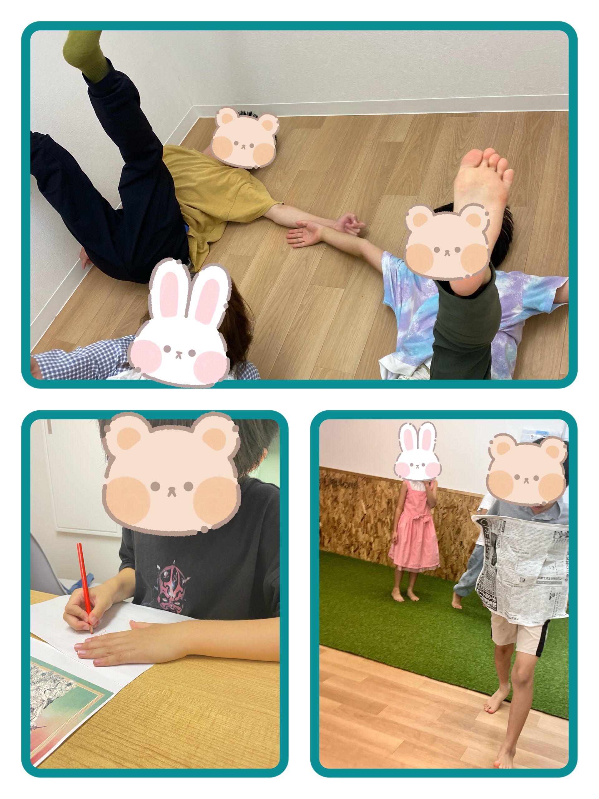 ①のゆらゆら体操では心と体をほぐして、クールダウンや気持ちの切り替えにつなげることを目的に、②の新聞紙リレーでは楽しみながら体幹やバランス感覚を使うこと、③のハロウィンゴーストトレースでは好きなイラストを写すことで好きなものに触れながら、手先を使った微細運動と集中力を育てることを目的に取り組みました✨