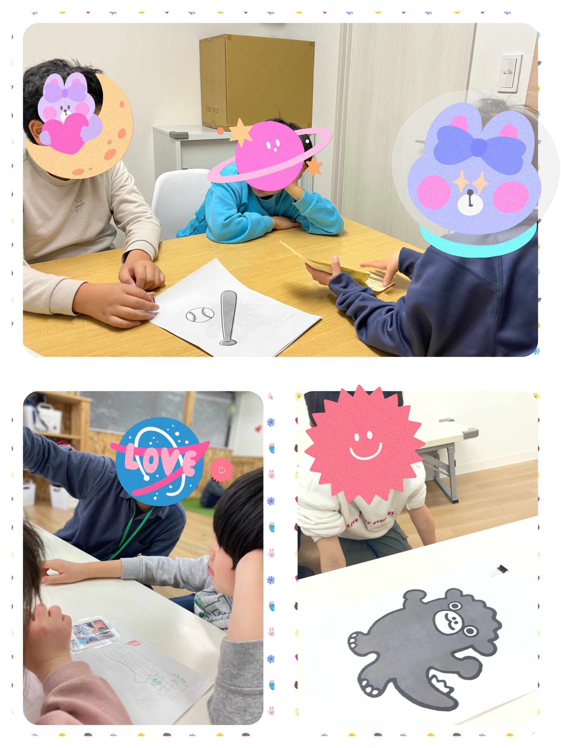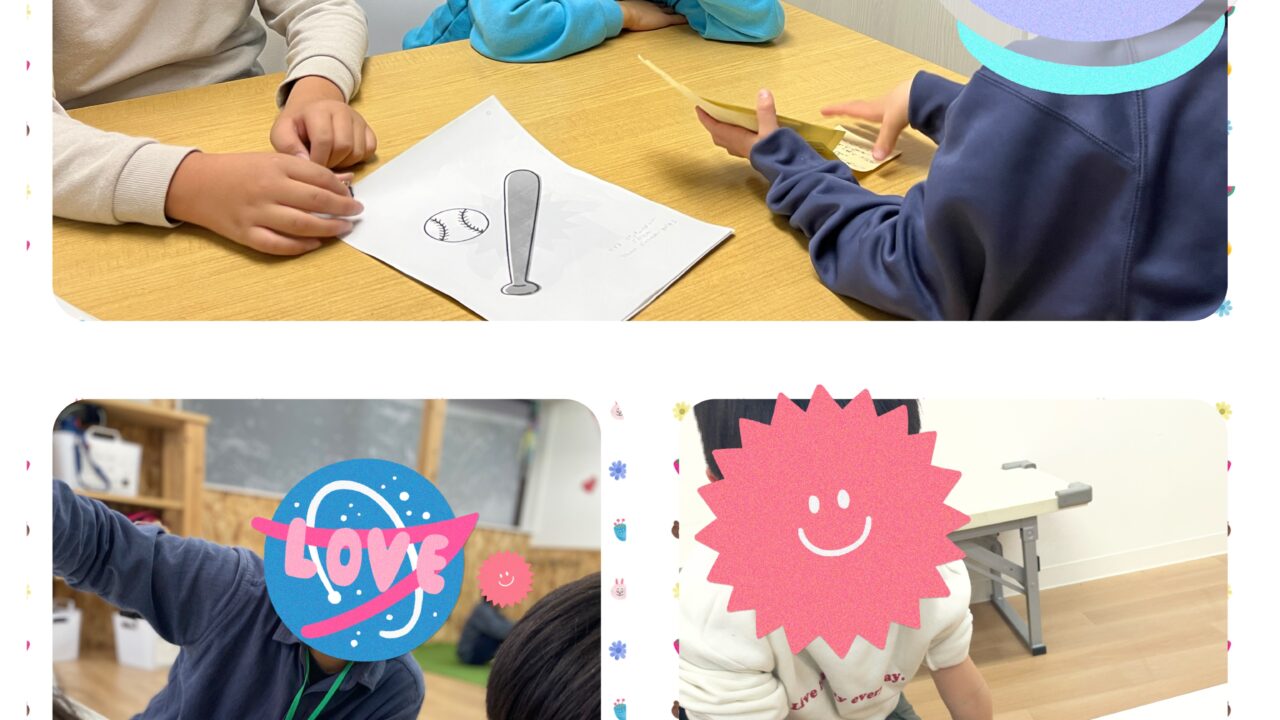 2~3人のグループに分かれて出されたイラストのお題(有名なキャラクター、テントウムシ、ソフトクリームなど)を褒めてもらいます。鬼やおばけなど難しめなものも用意して、ゲーム感覚で楽しんでもらいました!